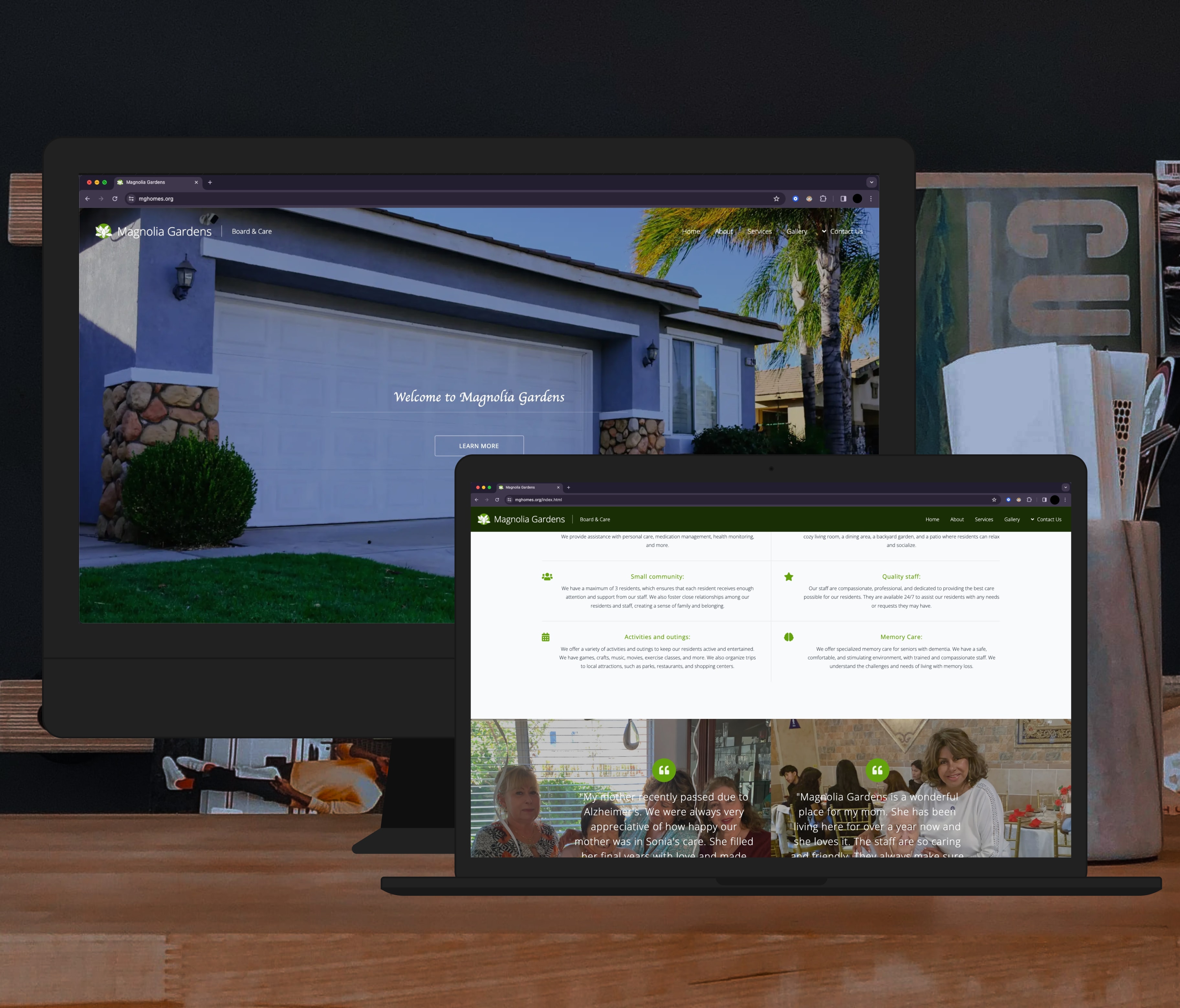 After years of providing service to a small number of clients and establishing a location for a facility, Magnolia Gardens' Founder Sonia decided she was ready to bring in one more client and wanted to build a web presence and develop marketing materials for moving foward.